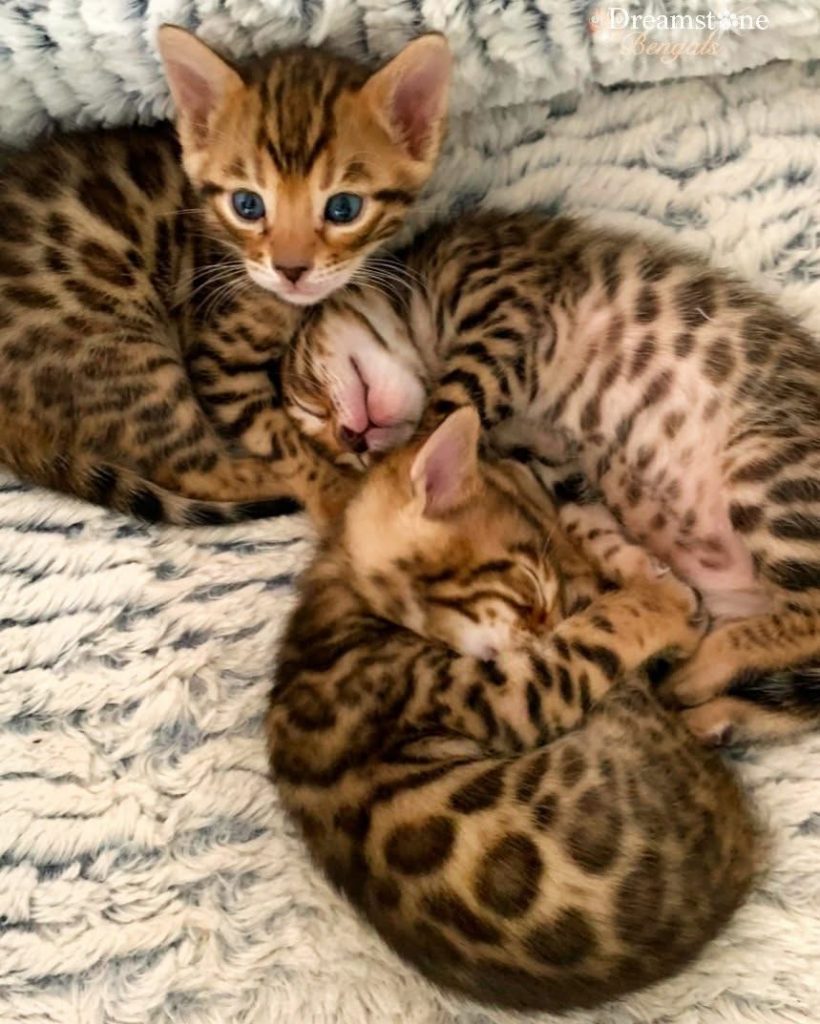 The Bengal cat has many attributes to a wild cat . Bengal kittens as like wild cats too undergo a period of “fuzzy” as a camouflage against predators in the wild . The “fuzzy” stage or more commonly known as the “fuzzies” can last up to the age of 6 months . After this time their beautiful coats will clear up to show off their amazing spots/rosettes (see our stunningly beautiful rosette Queens). The Bengal colours and coat will continue to develop further for the following 2 years.