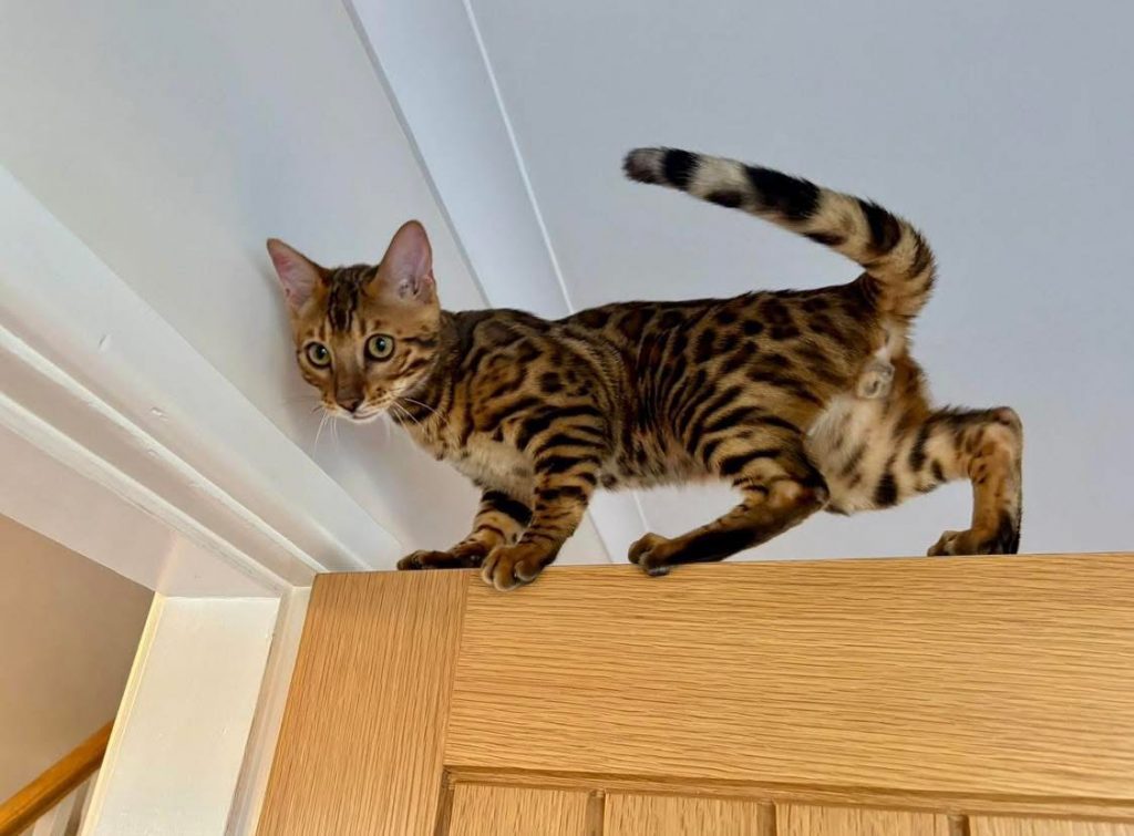 Bengals are highly intelligent and observe their humans behaviours carefully. They love to test actions to see what works. For example, if they see you twist a handle, pull a lever, or push a door, they may experiment until they figure out the same movement themselves.