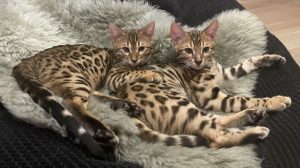 We are so overjoyed with our Mango and Peaches. From the very start of the experience up until collection Tory and Stu have been absolutely fantastic. They are extremely passionate and knowledgeable about cats and the Bengal breed in particular. We always felt we could ask any question or advice along the way. It was great to receive weekly updates. Mango and Peaches have beautiful, friendly and sociable temperaments. They love fusses, they follow you around and happily go off independently playing together. We could not ask any more of the process. We are extremely happy and grateful to Tory and Stu for taking so much time and care in raising their beautiful Bengals babies. We are so glad that we chose to have two, they are best friends. From Sian, Jamie, Mango and Peaches.